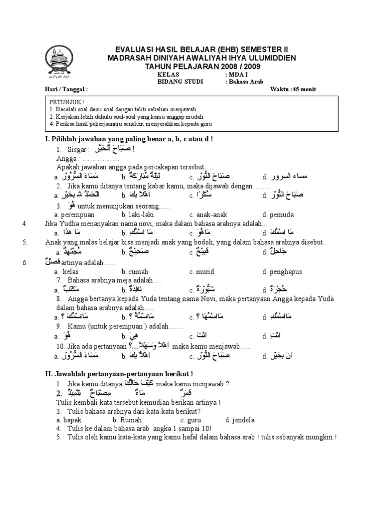 Persiapan kegiatan penilaian akhir semester (pas) tahun 2018/2018. Download soal bahasa arab kelas 2 semester ganjil. Kumpulan soal ukk sma kelas 10 semester genap 2 lengkap. Soal dan kunci bahasa indonesia kelas 1 sd semeste. Doc rpp bahasa arab k13 aurian firmansyah academia edu.